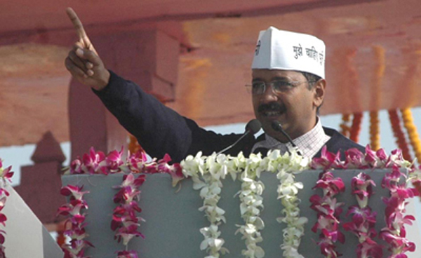 Delhi Chief Minister Arvind Kejriwal addressing the gathering just after taking the oath as Chief Minister of Delhi, during oath ceremony in New Delhi on Saturday. (UNI)