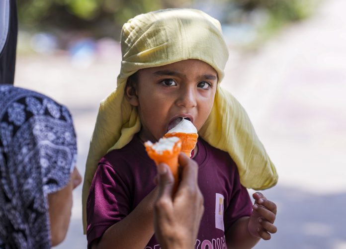 A child eat an ice-cream to beat the heat during a summer afternoon, in New Delhi.