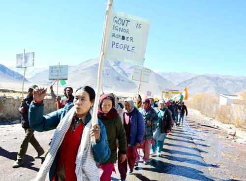 LEH (Nyoma), Oct 23: Demanding early completion of Dungti-Demchok road, the people of Demchok and Koyoul, residing on the Indo-China border jointly staged a peaceful protest march from 124 RCC GREF office to SDM office Nyoma.