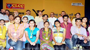 Deputy Chief Minister Dr Nirmal Singh along with other ministers and Speaker posing for a group photograph with meritorious students at Jammu on Sunday.