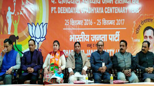 Deputy CM, Dr Nirmal Singh and BJP State President Sat Sharma at a workshop organised by Party’s Mahila Morcha at Jammu on Saturday.