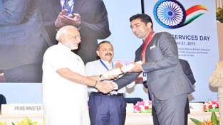 Deputy Commissioner Kathua, Dr Shahid Iqbal Choudhary receiving award from Prime Minister, Narendra Modi at Vigyan Bhawan, New Delhi. Also seen in the picture is Union Minister Dr Jitendra Singh.