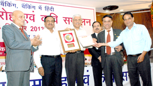 Deputy General Manager Mohd Lateef Mir and Senior Manager, Rajbhasha receiving shield and award from Executive Director of the Bank in New Delhi.