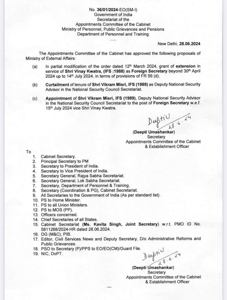 The Appointments Committee of the Cabinet has approved the appointment of Misri, Deputy NSA in the National Security Council Secretariat, to the post of Foreign Secretary with effect from July 15, said the order issued by the Personnel Ministry.