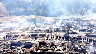 The inferno, which broke out in one of the thatched houses, turned the entire village into ashes forcing around 600 souls to spend night in open. The fire was brought under control this morning with strenuous efforts of people, police, fire fighters and Army personnel.