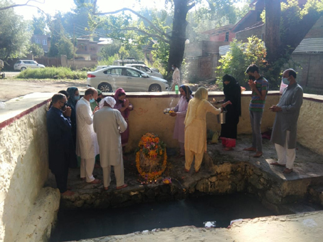JAMMU, Aug 7: Observing the restrictions imposed due to spread of COVID pandemic a selected number of pilgrims from different surrounding villages today visited the ancient shrine of Nowdal at Tral, Awantipora in South Kashmir district Pulwama today to participate in annual Nowdal yatra and performed the Rudra Maha Abisheikh of pious Shivlingam in one of the springs at the shrine.