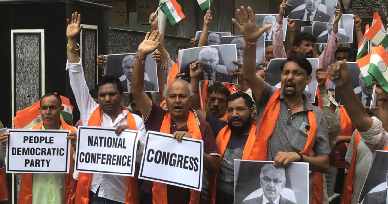 The protestors led by Ashok Gupta, president, DF-SS raised slogans against Pakistan Defense Minister and demanded an answer from NC-Congress alliance regarding the statement.