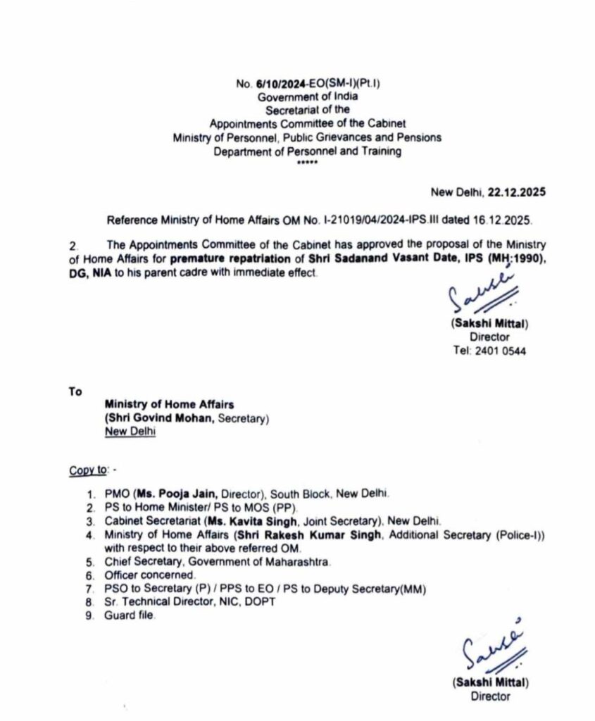 New Delhi, Dec 23: The Appointments Committee of the Cabinet (ACC) has approved the premature repatriation of Shri Sadanand Vasant Date, IPS (MH:1990), Director General of the National Investigation Agency (NIA), to his parent cadre with immediate effect.