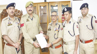 DGP Dr SP Vaid giving commendation certificate to constable Rajesh Kumar for his courageous act. By Daily Excelsior - April 2, 2017 Share FacebookTwitterWhatsAppPinterestLinkedinCopy URLTelegramEmailTumblrReddItPrintKoo DGP Dr SP Vaid giving commendation certificate to constable Rajesh Kumar for his courageous act. DGP Dr SP Vaid giving commendation certificate to constable Rajesh Kumar for his courageous act. Follow our WhatsApp channel