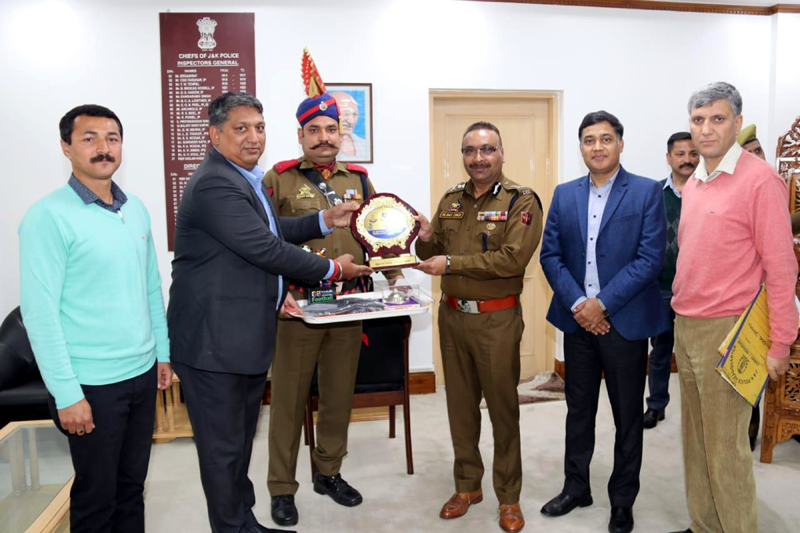 JAMMU, Feb 20: SO (Sports) APHQ SSP Dushyant Sharma presented three mementos to the DGP J&K Dilbag Singh today in connection with 68th Bn Mullik Memorial All India Police Football Championship, 68th All India Hockey Championship and 19th All India Water Sports Championship, received from All India Police Sports Control Board New Delhi.