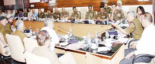 DGP Dr S P Vaid chairing a meeting in Jammu on Monday.