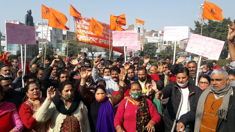 Ex-President Kernail Chand Thakur, ex-General Secretary, Pritam Sharma, Working President Rajinder Shastri, Sunit Sharma, Sanjeev Kumar Sharma, Subash, Pt Parshotam, Pt Brijmohan Sharma, Pt Om Parkash, Pt Rampal, Pt Balwant Shastri, Vimal Khajuria, Sat Paul, Pawan and others took part in the protest demonstration.