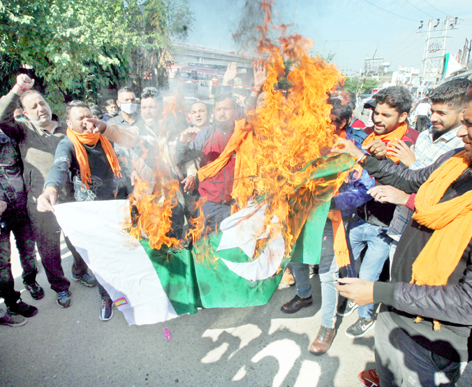 Activists of Bajrang Dal torching Pakistan flag during a protest at Jammu on Friday. -Excelsior/Rakesh