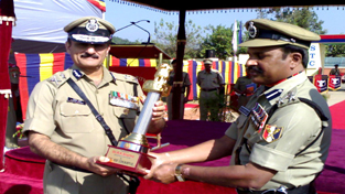 DIG BSF J C Singla presenting a memento to IG Frontier Jammu, Rakesh Sharma during passing out parade at STC Udhampur on Saturday.