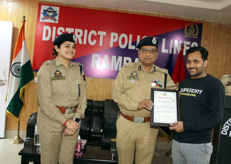 RAMBAN, Apr 19: Doda-Kishtwar Ramban range Dr Sunil Gupta DIG DKR today fecilitated Neetan Gupta, a vegetable vendor by profession for installing CCTV camera at his shop at Chanderkot which helped Ramban police in nabbing a thief. CCTV camera installed by Neetan Gupta S/o Late Vijay Gupta R/o JP Gate Chanderkote at his shop under ‘operation third eye’, helped police station Chanderkot in solving a theft case registered under fir no. 41/2022 U/S 457/380 IPC, as the local police successfully nabbed the accused.