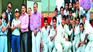 Dignitaries Jhonny Williams, Ram A Vishwakarma and Rakesh Gandral presenting awards to budding cricketers Praful and Aman (L) Stadium XI U-14 team posing for a group photograph alongwith winners trophy on Thursday.
