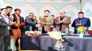 Dignitaries receiving bouquets from the Organizing Committee members of the Sher-e-Kashmir Cricket Tournament at Sports Stadium, Udhampur.