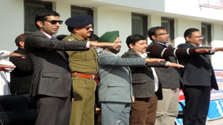 Dignitaries taking oath during awareness drive of Election Commission at Reasi on Tuesday.