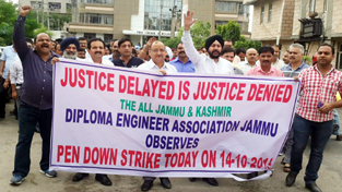 Diploma Engineers raising slogans during pen down strike at Jammu on Wednesday. —Excelsior/Rakesh