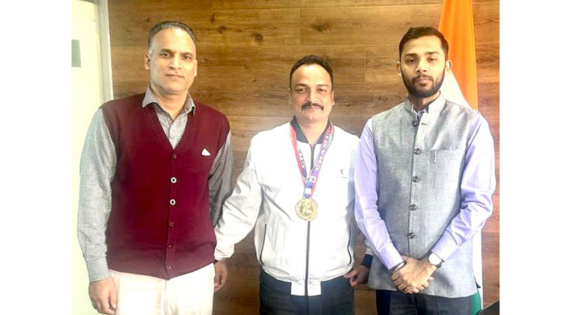 JAMMU, Nov 10: Director Information and Public Relations, Nitish Rajora today felicitated Gagan Jamwal an employee of the Directorate of Information and Public Relations (DIPR) for clinching gold medal in District, J&K UT Roller Skates and 2nd J&K Master Games-2025 Championships recently held at MA Stadium Jammu.