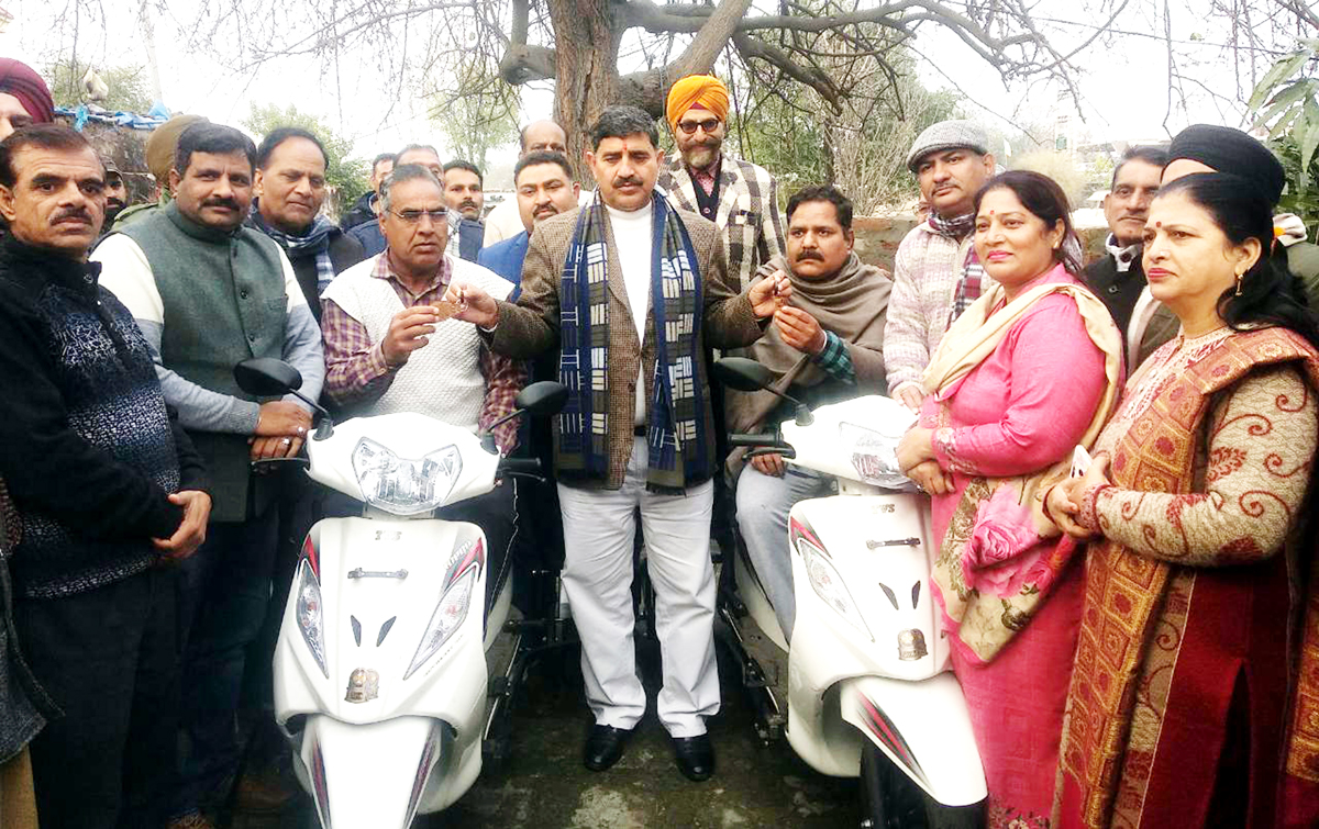 R.S PURA, Jan 15: MP Jugal Kishore Sharma today gave two Scooties from his MP fund to two differently abled persons at a function organized by Mita Sharma, BJP Mahila Morcha head at village Prem Nagar, Miran Sahib.