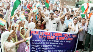 Displaced persons from PoJK staging protest at Dogra Chowk in Jammu  on Tuesday.     —Excelsior/Rakesh