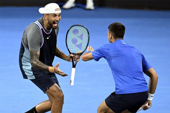 DJokovic and Kyrgios won their opening doubles match, a crowd-pleasing, fist-pumping affair by both players at Pat Rafter Arena.