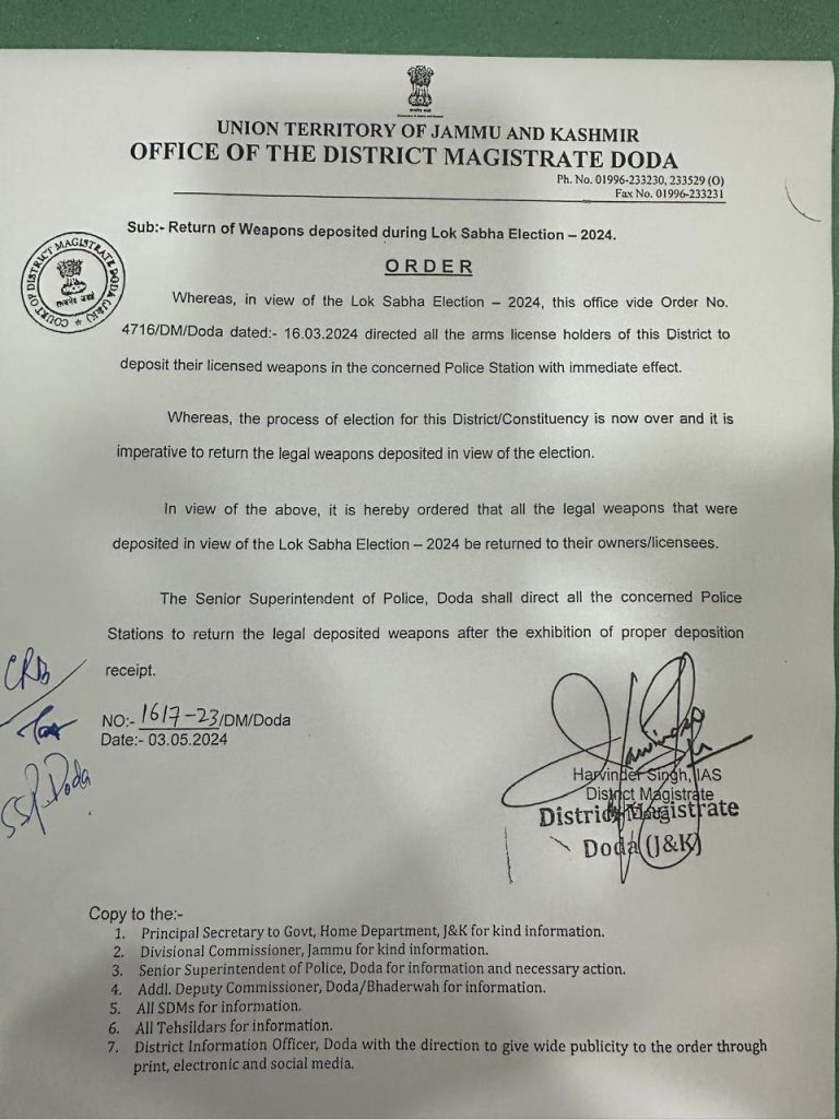 DM Doda Directs Police to Return Legal Weapons to Licencees By Daily Excelsior - May 3, 2024 Share FacebookTwitterWhatsAppPinterestLinkedinCopy URLTelegramEmailTumblrReddItPrintKoo DC reviews drug abuse control measures in Doda DM Doda Directs Police to Return Legal Weapons to Licencees Follow our WhatsApp channel