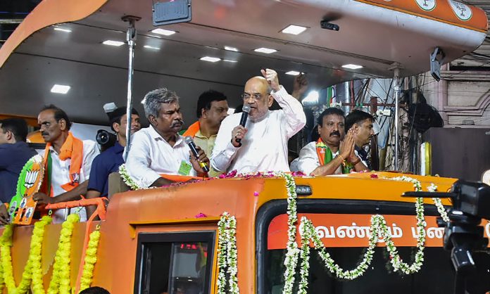 Shah greeted the cadres from his specially-designed vehicle and flashed the party’s Lotus symbol throughout the stretch, as party members chanted “Modi again”, “Bharat Mata Ki Jai” and “Ponnar again.”
