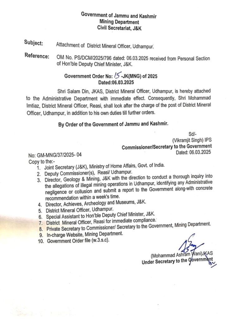 Jammu, Mar 6: The Mining Department has attached Salam Din, District Mineral Officer (DMO) Udhampur, and attached him to the Administrative Department.