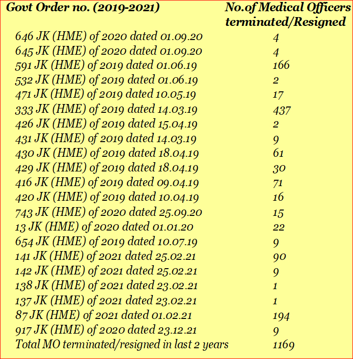 Becoming a doctor is one of the most challenging career paths one can embark upon. It requires intense hard work and perseverance before one starts to practice as a Doctor . Recently as per govt order no 141-JK(HME) of 2021 dated 25-02-21, 90 doctors out of 153 appointed medical officers who refused to join J&K govt health services, were terminated, 9 tendered resignation. Before this, 194 candidates out of 459 doctors opted not to join. So why there is waning interest in picking up the job in JK govt health services. In last 2 years, around 1169 (rough estimate ) medical officers have either resigned or terminated for not joining the service. There appear two main reasons, among others, behind this anticipated doctor drought. First is the harsh service conditions which are creating impediment in the career progression of Medical Officers and another is recruitment of medical officers in J&KHFW and lecturers in GMCs under SRO 192 dated 17-06-2020 (J&K Condition of service, pay and allowances rules).