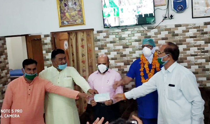 Dr Rajinder Kumar Sharma contributed Rs 21000 for PM CARES Fund. He presented cheque of the donated amount to former Minister and senior BJP leader Bali Bhagat at Swastik Nursing Home, Janipur, where the Minister also honoured doctors and paramedical staff.