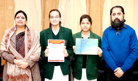 JAMMU, Jan 19: Students of DPS Jammu, who brought laurels in Inter-DPS National Annual Heritage Festival and Art Exhibition ‘Itihaas Ka Jharoke Se’ 2015, which was organized to celebrate the spectacular Indian Heritage at DPS Noida, Uttar Pradesh. The students who excelled included Riya Rastogi of class XII and Aru Bhola of class IX. In a special assembly held today, Principal DPS Jammu, Ruchi Chabra lauded the efforts of both the students for this achievement.