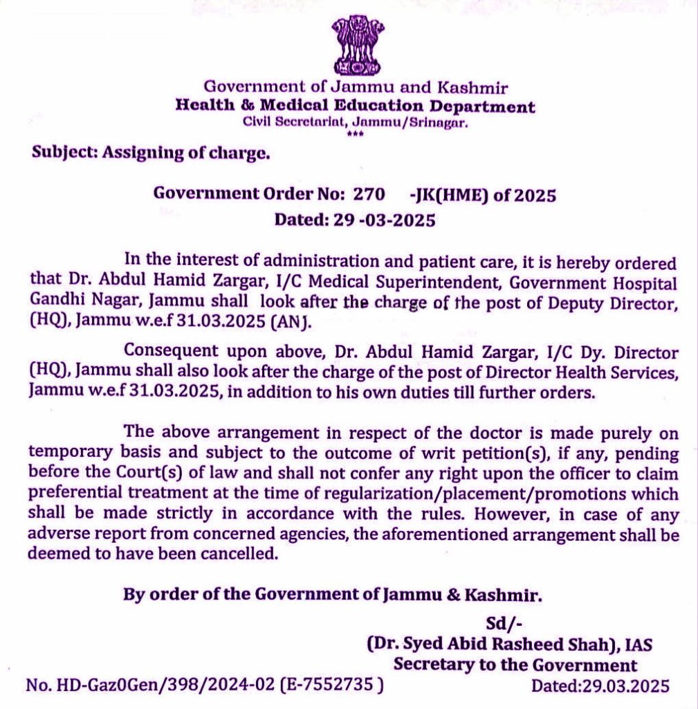 JAMMU, Mar 30: The Jammu and Kashmir Health & Medical Education Department has assigned Dr Abdul Hamid Zargar, In-Charge Medical Superintendent of Government Hospital Gandhi Nagar, Jammu, to take over as Deputy Director (HQ), Jammu, effective March 31, 2025.