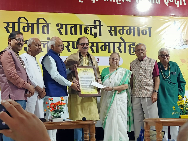 INDORE, (MP) June 28: Eminent Hindi poet, writer, thinker, Kashmir folklore enthusiast, Dr.Agnishekhar and noted writer Dr Devendra Deepak were today conferred prestigious Centenary Awards (Shatabdi Samman) of Shrimadhya Bharat Hindi Sahitya Samiti Indore by Padmbhushan Sumitra Mahajan, former Speaker, Lok Sabha and Vinay Sahsrabuddhe, president of the Indian Council for Cultural Relations. The award carries cash reward of Rs one lakh, besides Shawl, Shrifal and Memento.