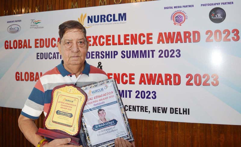 New Delhi, May 28: Dr. M.L. Dogra, an Indian theatre personality and scholar, of Jammu and Kashmir, UT known for bringing creative Dogri and Hindi theatre, awareness through folk media, lyrical Musical plays internationally, was awarded “Global Education Excellence Award & Global Star Excellence Award 2023 ” for his achievements and contribution in Computer and Music Education by the Global National Urban Rural computer literacy & Skill Development mission at India International Cultural centre ,New Delhi supported by MSME & Ministry of Cooperate Affairs Government of India.