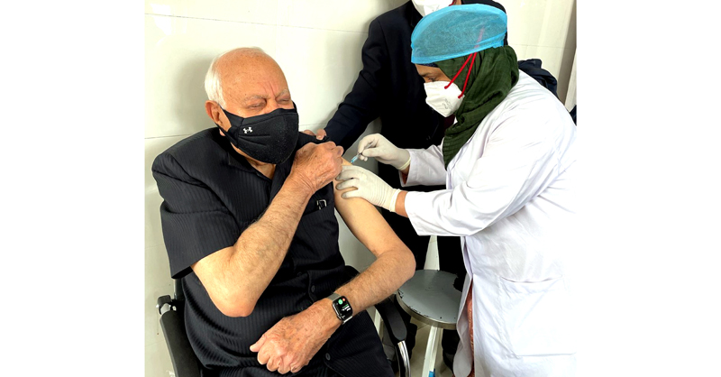 Srinagar/Jammu/Leh, Mar 2: With the COVID-19 vaccination process on since January, former Chief Minister and president National Conference Dr Farooq Abdullah along with his wife Mollie Abdullah today received their first shot of vaccine at SKIMS Soura.