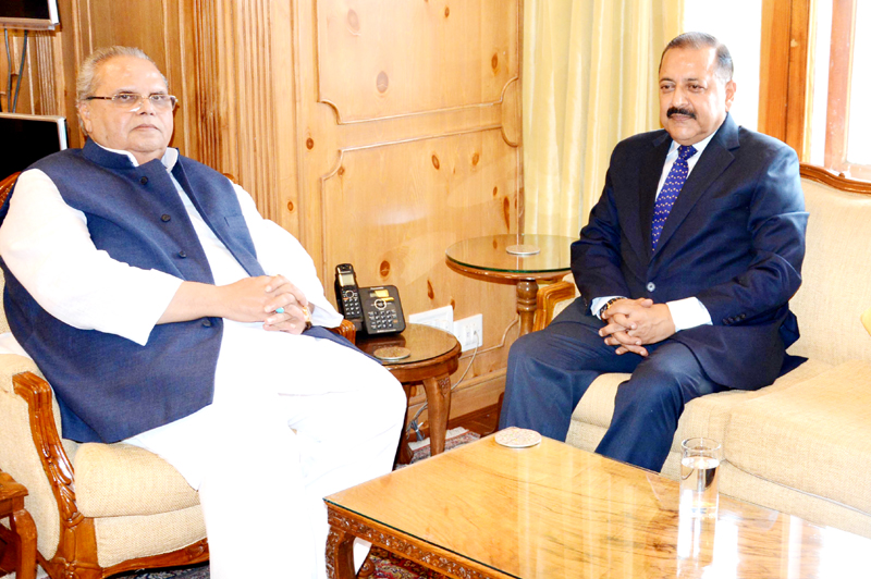 SRINAGAR, Aug 23: Union Minister of State (Independent Charge) for Development of North Eastern Region (DoNER), MoS PMO, Personnel, Public Grievances & Pensions, Atomic Energy and Space, Dr Jitendra Singh today called on Governor Satya Pal Malik, who had taken over as the head of the State in a brief oath ceremony earlier in the day.