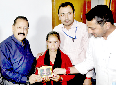 UDHAMPUR, Mar 24: Union Minister in PMO, Dr Jitendra Singh today presented an award along with a certificate of merit and a memento to a 10th class girl Nisha Rani of a remote village Lower Kud and a student of Government Higher Secondary School Kud in Udhampur district who had gone on hunger strike to persuade her parents to construct individual household toilet at their residence.