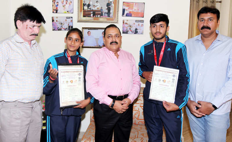 JAMMU, Oct 22: Union Minister of State (Independent Charge) in Prime Ministers Office, Dr. Jitendra Singh felicitated medallists of 4th Asian Pencak Silat Championship 2018 senior (men & women) held at Sher-e-Kashmir Indoor Sports Complex, Srinagar recently.