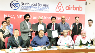 Dr Jitendra Singh, flanked by senior officials of Ministry of DoNER and Regional Heads of world’s leading American company dealing in hospitality and tourism, “Airbnb International”, during the signing of MoU by “Airbnb” with North Eastern Council, at New Delhi on Monday.