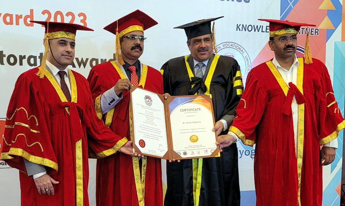 The Degree was presented to Dr Malhotra by Pro-Chancellor of the University during the convocation which was attended by delegates all over the world. Dr Malhotra has become the first medical professional from J&K to have been bestowed upon the PhD (Honoris Causa) from an International University. Dr Malhotra an alumnus of Government Medical College, Jammu did his MBBS in 1989 followed by Post Graduation (MD) in Pharmacology in 1997.