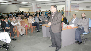 Dr S K Bali, HoD Nephrology, GMC, speaking at a function on World Kidney Day, held at Super Specialty Hospital in Jammu on Thursday. — Excelsior/ Rakesh