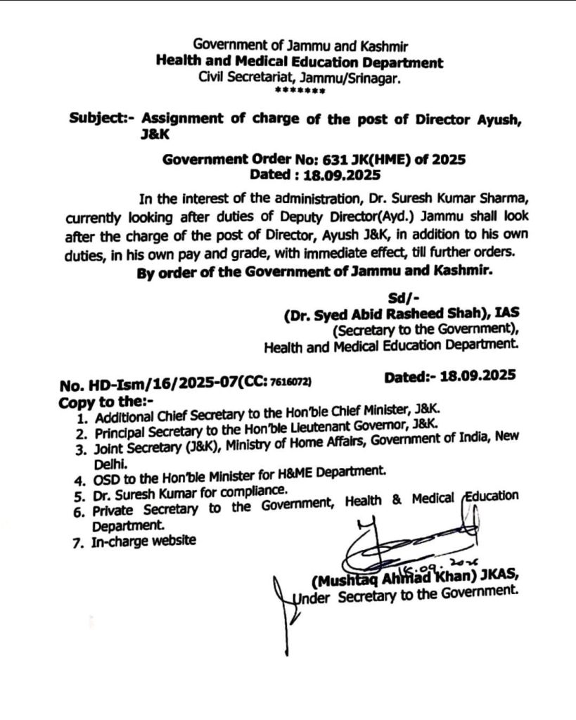 Jammu, Sept 18: The Government of Jammu and Kashmir has assigned Dr Suresh Kumar Sharma, presently looking after the duties of Deputy Director (Ayurveda) Jammu, the additional charge of Director Ayush J&K.