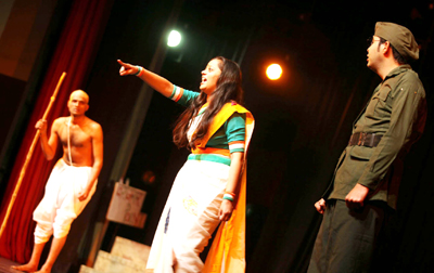 The idealistic vision of national heroes pitted against the contemporary maladies highlighted in the play kept the audience engrossed. The team of actors directed by Shashi Bhushan carried the play well. The cast included Sanjay Sonkar as Gandhi ji, Ashish Bhat as Subash Chander Bose, Avni Jain as Bharat Maa, Ganesh Singh Rajput as Mahanagar, Parveen Kumar as Gaon, Irfana Banoo as Sanskriti, Hassan Malik as Samaj, Sandeep Sharma as Naya Smaj, Devanshu Raina as Sainak/Mazdoor Neta, Anoop Goswami as Kalayug, Shishupal Khajuria as Boss/Neta, master Tatvagya Bhargav as Little Gandhi ji, Daksh Sagoch as little Subhash Chander Bose and Shashi Bhushan as Lekhak/Sharabi/Lala. Tomorrow ‘Pancham’ will present Mahesh Elkunchwar’s Pratibimbh under direction of Ifra Kak.