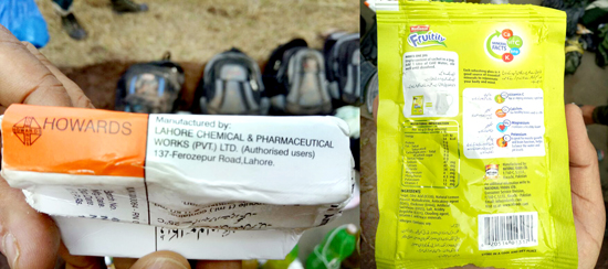 Drugs manufactured by Howards at Lahore Chemical and Pharmaceutical Works (Private) Limited, 137-Ferorezepur Road, Lahore, juice packets of National Fruitily at National Foods Limited 160-C, S.I.T.E, Karachi Pakistan and Nestle Milk, Made in Pakistan were also recovered from the slain militants, which indicated that the militants had been sent by Pakistan with the objective of carrying out suicide attack on security installations on this side. The food and juice packets and drugs were meant for prolonging the gunbattle.