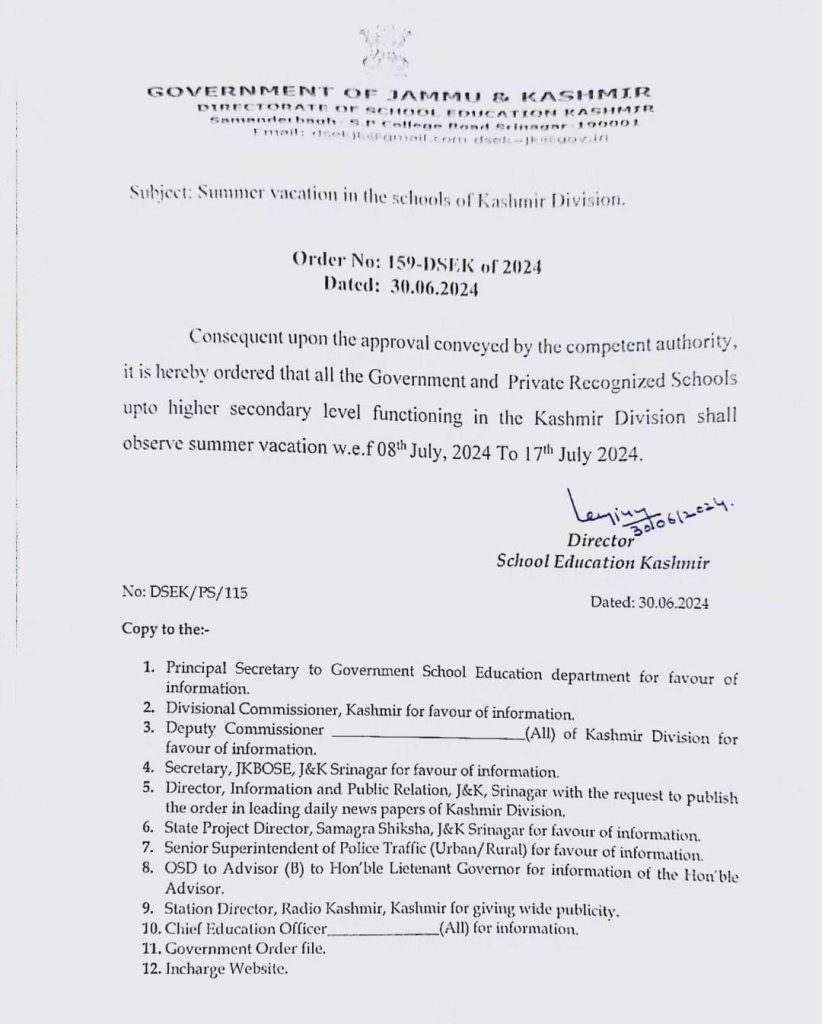 JAMMU, June 30: The Director School Education Kashmir (DSEK) has announced 10 days’ summer vacations in Government and private schools upto Higher Secondary Schools in the Kashmir Division. As per an order, the vacations begin on July 8 and end on July 17.