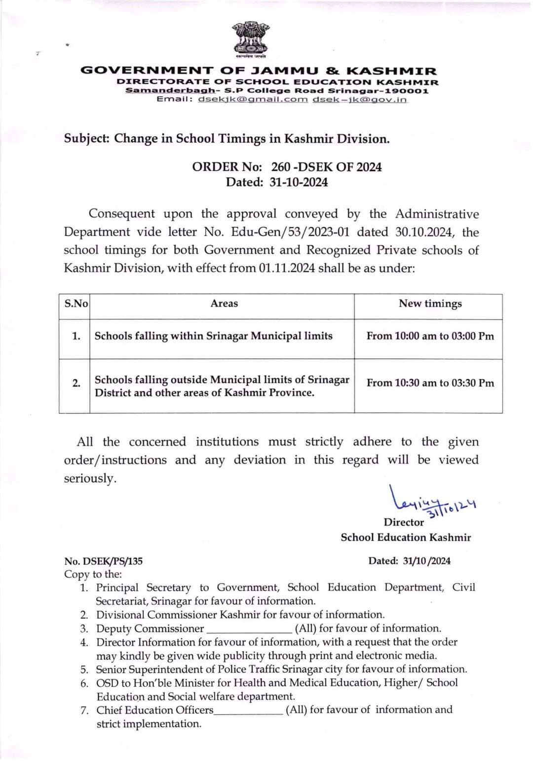 SRINAGAR, Oct 31: The Director of School Education Kashmir (DSEK) Thursday ordered change in school timing for Kashmir division with effect from November-01.