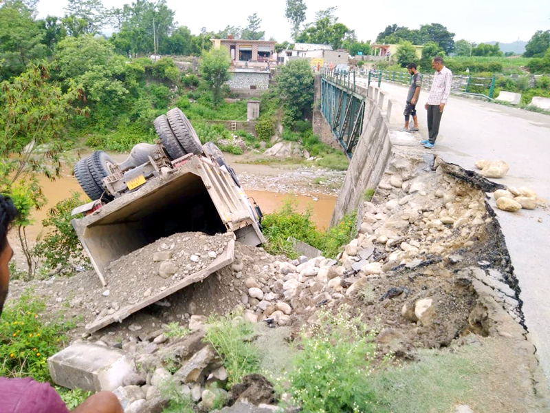 REASI, July 19: A dumper overturned when a portion of the road caved in near Babbar bridge on Dera Baba-Reasi road, here today.