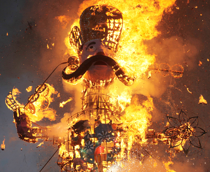 The portrait of demon king Ravana in flames at Parade Ground Jammu where the Dussehra festival was celebrated on Thursday.— Excelsior/Rakesh